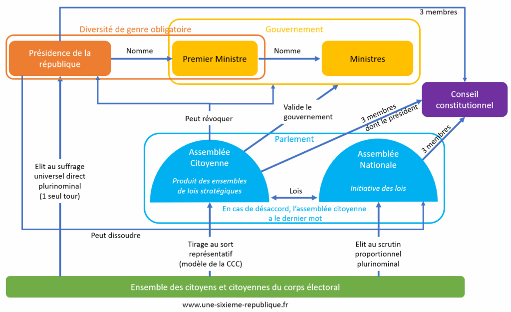 Enfin, l’Assemblée Citoyenne contrôle l’action de la présidence et du gouvernement (voir ci-desous).